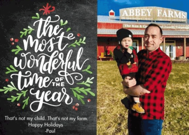 This card is peak “I’m doing great, actually,” energy. Paul stands there proudly in front of a random farm, holding a random child, fully committed to the bit that absolutely nothing in this picture belongs to him. The caption seals it: “That’s not my child. That’s not my farm.” Iconic honesty.